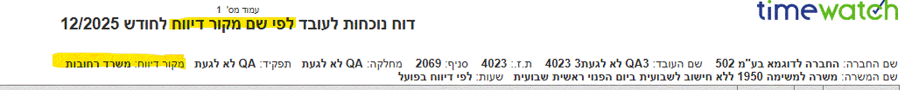 הפקת דוח נוכחות לפי שם מקור דיווח