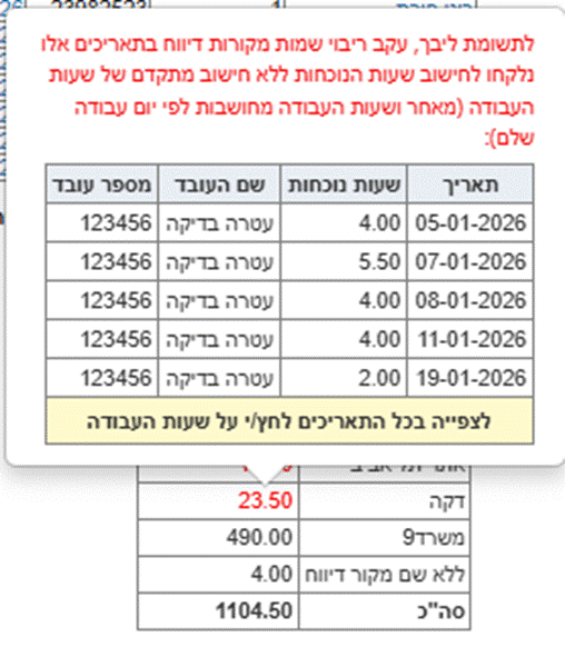 במידה ויש שעות ללא שיוך למקור דיווח – תופיע שורה