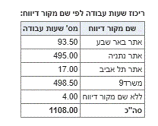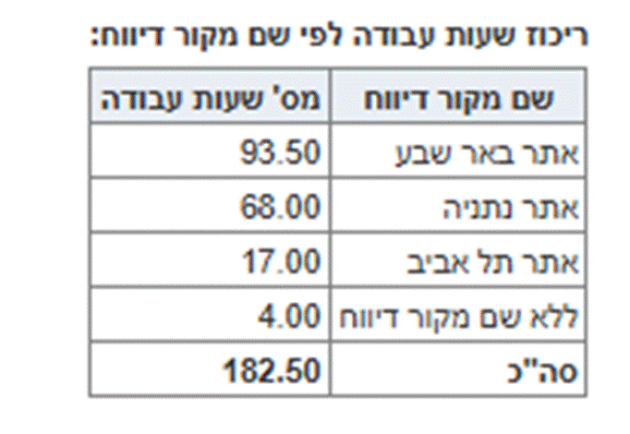 הטבלה מסכמת את שעות העבודה לפי שם מקור דיווח, בהתאם